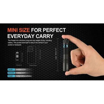 Είναι εξοπλισμένος με LED υψηλής βαθμολογίας CRI≥90, ενώ μπορεί να αναπαράγει τα χρώματα με μεγαλύτερη ακρίβεια. Παρέχει μέγιστη απόσταση δέσμης 86 μέτρων, μέγιστη έξοδο 550 lumens, και τροφοδοτείται από μια επαναφορτιζόμενη μπαταρία μεγέθους AA που ενσωματώνει επάνω μια διεπαφή USB-C για φόρτιση (είναι επίσης συμβατός με αλκαλική μπαταρία ή με μπαταρία NiMH AA). Ο Pokelit AA είναι απαραίτητος για το σπίτι και για κάθε υπαίθρια δραστηριότητα.