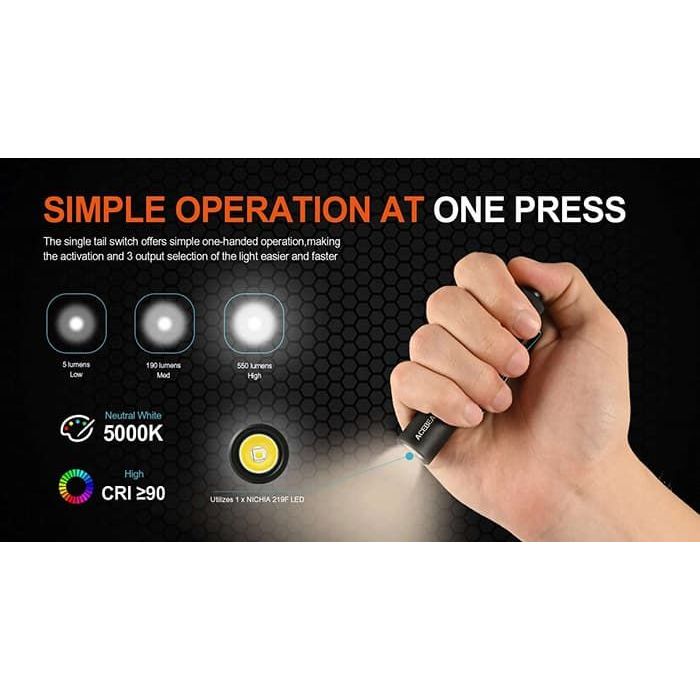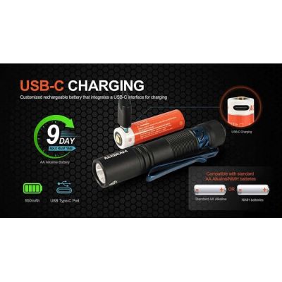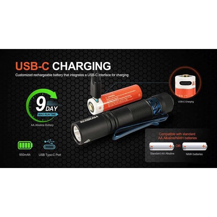 - Τροφοδοτείται από επαναφορτιζόμενη μπαταρία Li-ion ACEBEAM 14500 με ενσωματωμένη θύρα φόρτισης USB-C.