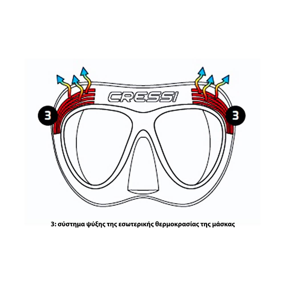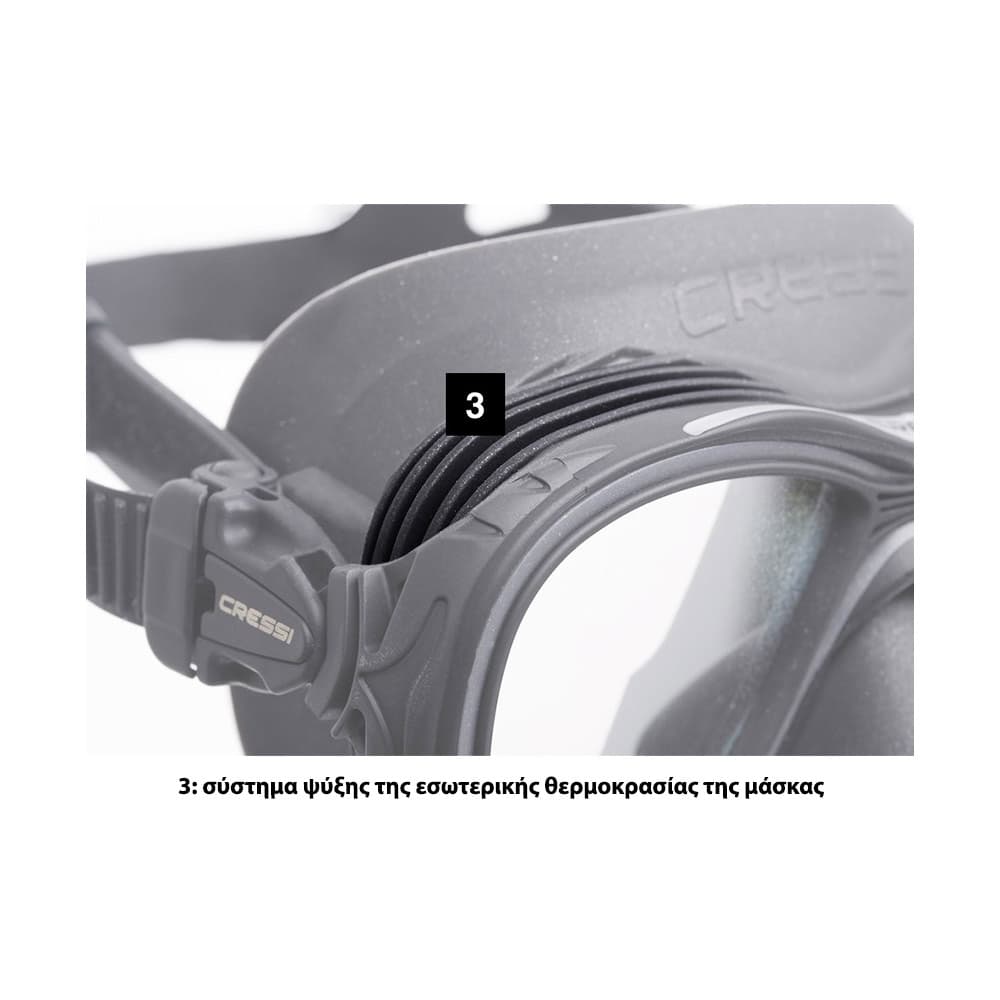 Το εξωτερικό μέρος της φούστας διαθέτει ένα σύστημα ψύξης που αποτελείται από δύο μικρούς εναλλάκτες θερμότητας που λειτουργούν ως “καλοριφέρ”. Το αποτέλεσμα είναι ότι η θερμοκρασία μέσα στη μάσκα πέφτει, έρχεται πιο κοντά στην εξωτερική θερμοκρασία και τα σταγονίδια υγρασίας παγιδεύονται πριν φτάσει ο αέρας στους φακούς, εμποδίζοντάς τους να θολώσουν.